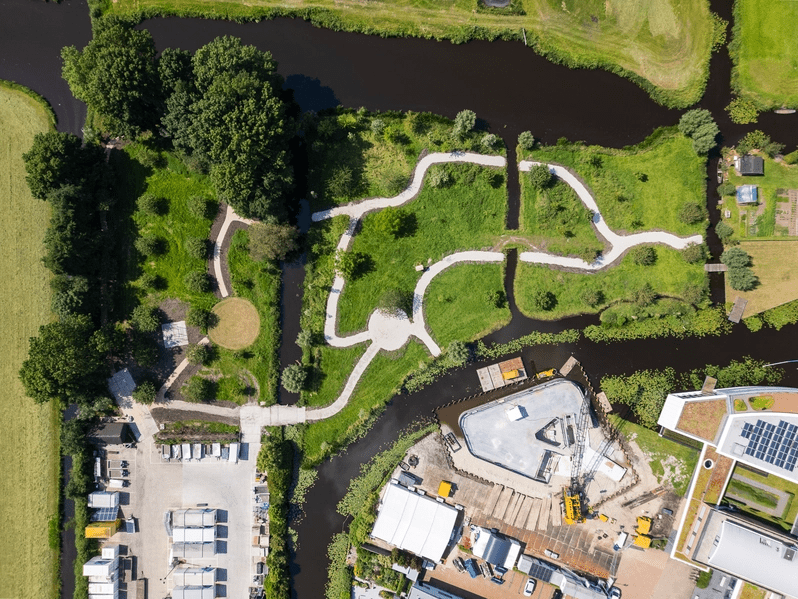 Tussen de verschillende eilanden zijn robuuste hardhouten bruggen, een ruime vlonder en composteerbakken geplaatst. Deze elementen vormen niet alleen functionele verbindingen, maar versterken ook de natuurlijke uitstraling van het terrein. Eén van de hoogtepunten is de grote vlonder, die een weids uitzicht biedt over de omliggende polder – een plek om even stil te staan en te genieten van het landschap.